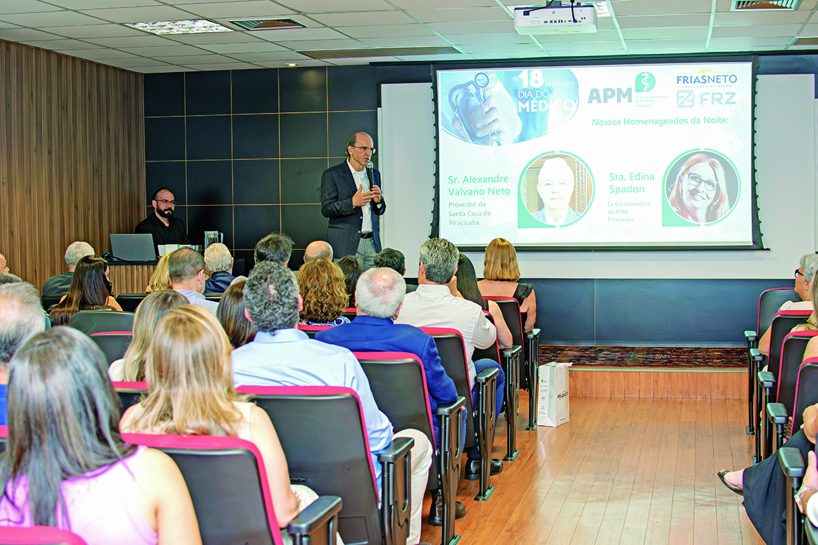 Na última quinta-feira, 17, o auditório Nadir Maria Manin Frias, na Frias Neto Consultoria de Imóveis ficou repleto de profissionais que atuaram para o crescimento na área da saúde em Piracicaba para uma sessão solene de homenagem pela atuação impactante na área da saúde, em prol do Dia do Médico, comemorado em 18 de outubro. A celebração cedeu homenagem ao Doutor José Eduardo Cançado, professor e pesquisador da disciplina de Pneumologia da FCMSCSP, Alexandre Valvano Neto, provedor da Santa Casa de Piracicaba e Edina Spadon, ex-colaboradora da Associação Paulista de Medicina de Piracicaba. A abertura foi pelos realizadores do evento, Angelo Frias Neto e Luiz Franzolin, do Grupo FRZ, além de ter como chairman o Doutor Douglas Koga, presidente da APM Piracicaba. Após a sessão solene, foi servido coquetel com delicioso espumante e degustação de queijos pela Queijos Cairol.