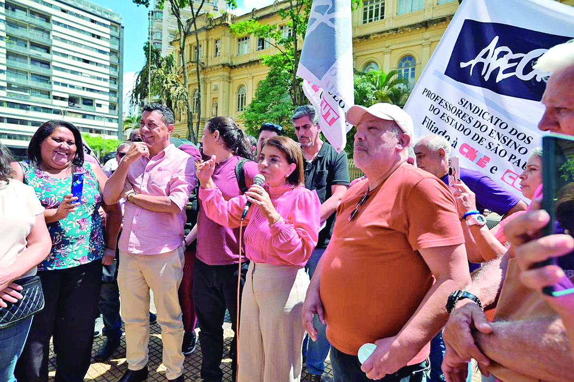 A Apeoesp promoveu ato público nesta manhã de ontem (26), na Praça da República, em frente à Secretaria Estadual da Educação, em defesa da educação pública e dos direitos dos profissionais do magistério paulista, quando foi ressaltada a importância da construção de uma greve da categoria contra os ataques ao magistério paulista. A direção da Apeoesp e a deputada estadual Professora Bebel (PT), que também é segunda presidenta da entidade, conseguiram reunião com o secretário executivo da Secretaria Estadual da Educação, Vinícius Neiva, quando foram apresentadas as demandas da categoria.