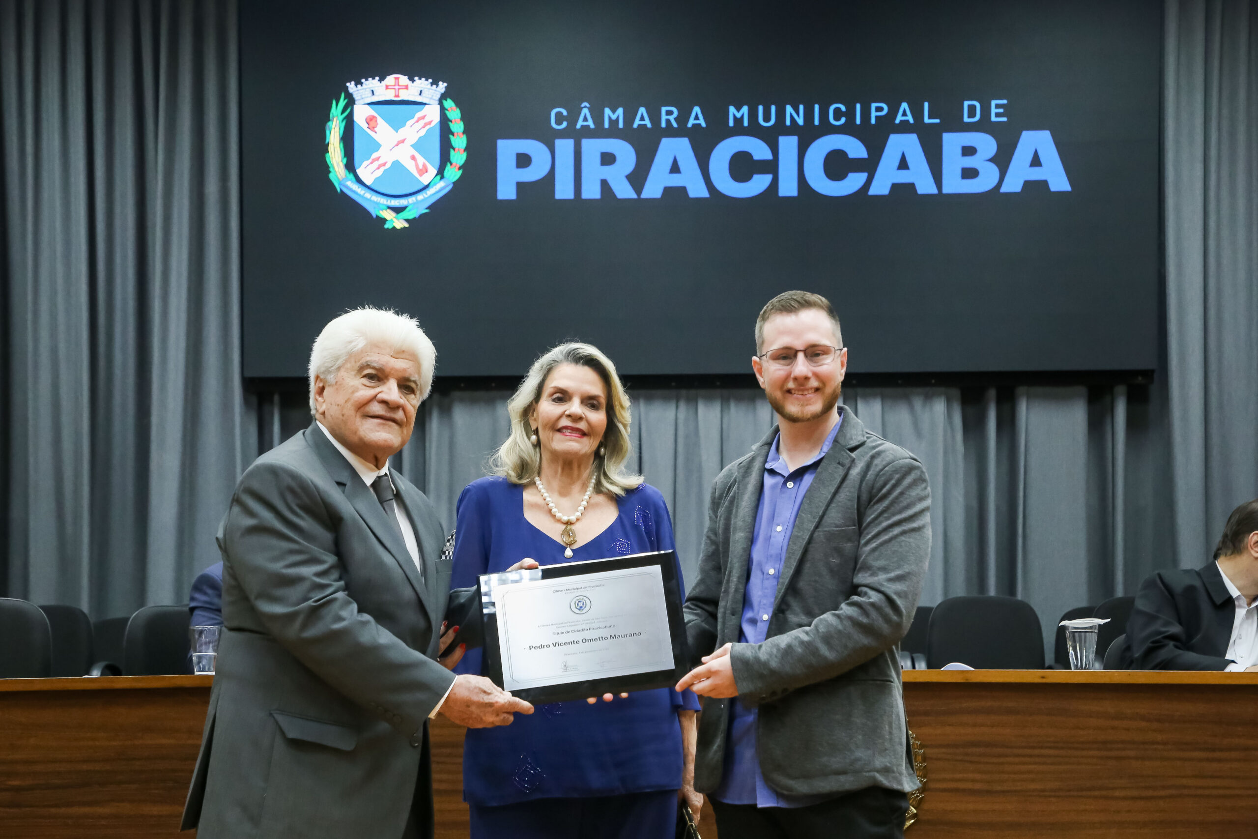 Em reunião solene promovida pela Câmara Municipal de Piracicaba nesta terça-feira (7), o empresário Pedro Vicente Ometto Maurano recebeu o Título de Cidadão Piracicabano, a partir do Decreto Legislativo nº 59/2024, de autoria do vereador Gustavo Pompeo (Avante). O homenageado, que também completou 82 anos de vida no dia da solenidade, reside em Piracicaba há 56 anos e se destacou na prestação de vários serviços nas áreas social e econômica da cidade.