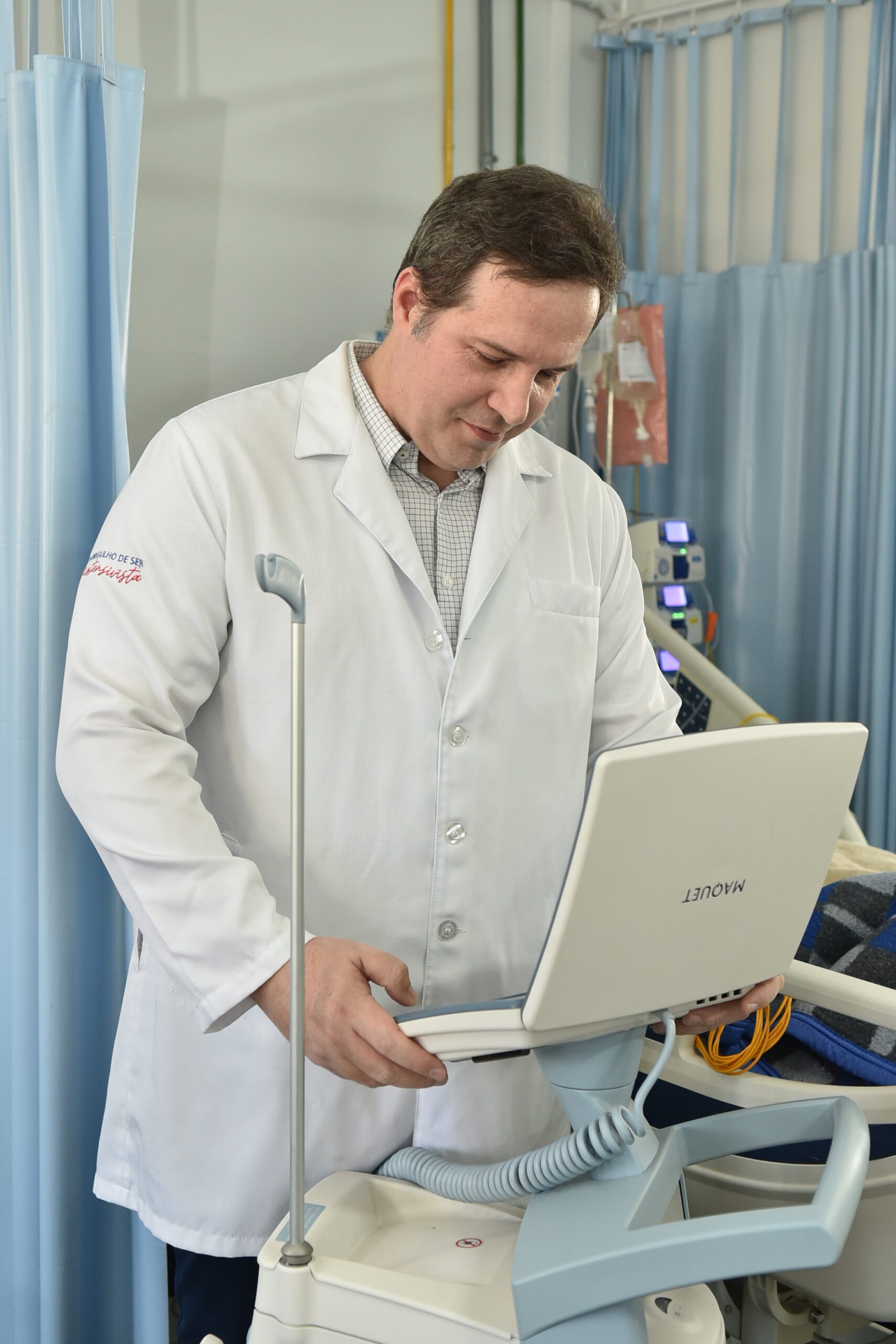 O médico coordenador das UTIs Adulto, Rafael Tineli, comemora a chegada do novo equipamento à Santa Casa de Piracicaba. CRÉDITO: Divulgação