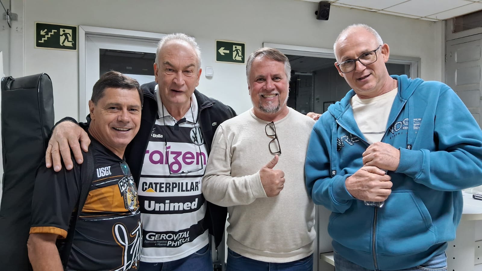 Participantes do programa Passe de Letra, que estreou nesta segunda-feira, 20, na Rádio Difusora FM 102,3. Da esquerda para direita o cantor/compositor Juninho Caipira, o comentarista Edvaldo Tietz, o apresentador Tarantini e o produtor Elvécio Lázaro. Que time! “Mas se tem futebol no rádio, tem alegria no povo”.