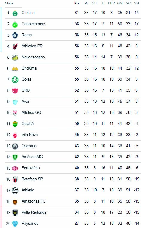 Classificação completa da Campeonato Brasileiro Série B 2025 após a 35ª rodada: