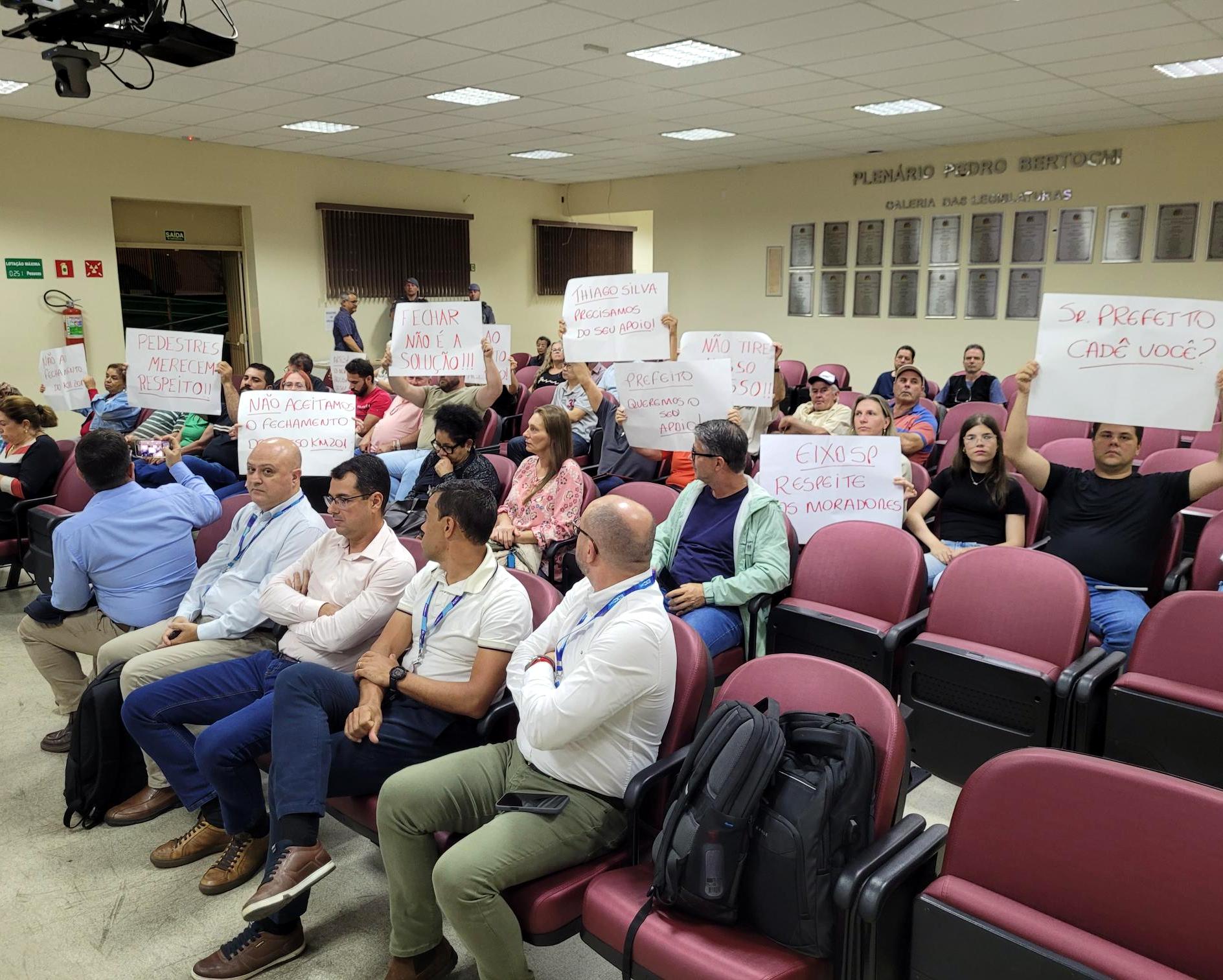 A última sessão realizada na Câmara Municipal de São Pedro, no dia 24 de novembro, foi marcada por protestos e muitos questionamentos sobre a construção do viaduto no km 202 e o possível fechamento da passagem do km 201, da Rodovia Geraldo de Barros (SP-304). Com cartazes nas mãos, moradores dos bairros Theodoro de Souza Barros, Alpes das Águas e Bela São Pedro aproveitaram a presença dos profissionais da Concessionária Eixo SP para cobrar explicações sobre a obra.