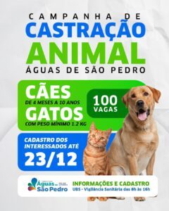 A Prefeitura de Águas de São Pedro, por meio da Vigilância Sanitária, abriu as inscrições para a Campanha de Castração Animal, iniciativa que reforça o compromisso do município com o bem-estar animal e a saúde pública. Ao todo estão disponíveis 100 vagas para castração de cães e gatos, conforme os critérios estabelecidos.