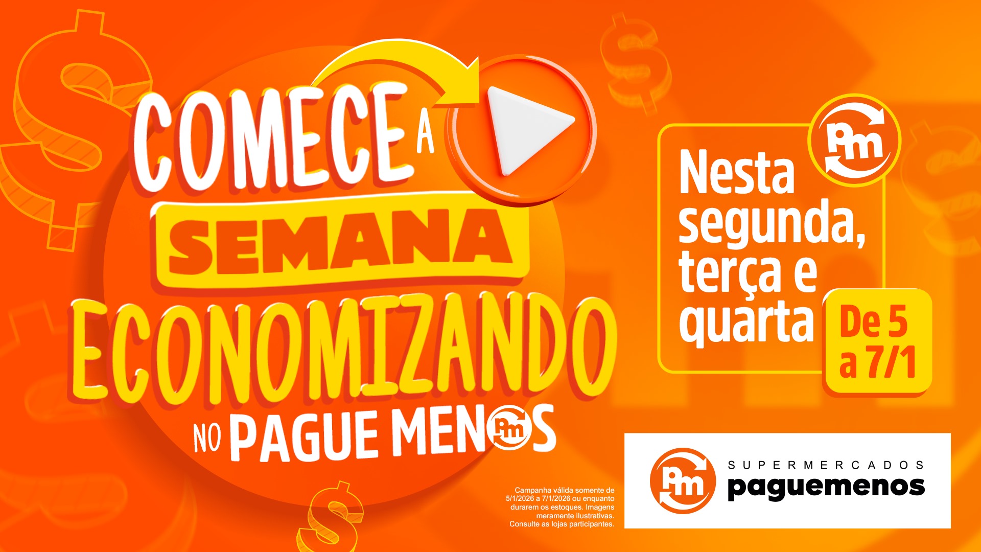 A ação “Comece a Semana Economizando” é válida exclusivamente nas lojas físicas da Rede de Supermercados Pague Menos, entre os dias 5 e 7 de janeiro de 2026. Para consultar o endereço e o horário de funcionamento das unidades acesse: https://www.superpaguemenos.com.br/unidades/s .