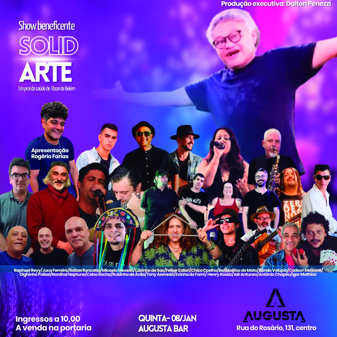SolidARTE, quinta-feira, 8, a partir das 19 horas, no Augusta Bar (Rua do Rosário, 131, Centro). Ingressos custam R$10,00 e podem ser adquiridos na portaria do evento