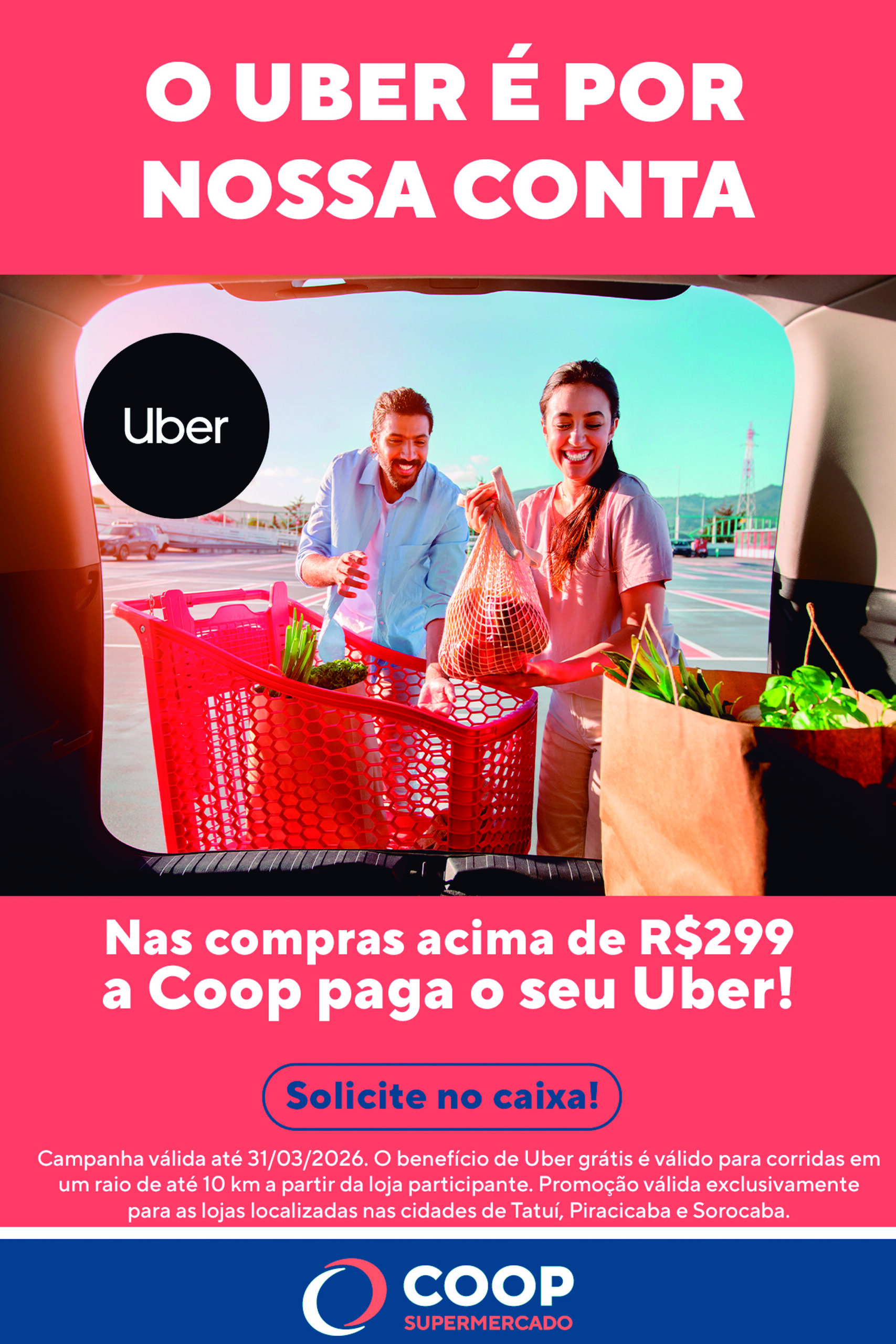 O benefício é destinado a cooperados e clientes que realizarem compras a partir de R$ 299,00 nas unidades da Rua Padre Madureira, 255, e da Avenida Itavuvu, 3.799, em Sorocaba; da Rua Coronel Lúcio Seabra, 772, e da Rua XI de Agosto, 345, em Tatuí; além da loja de Piracicaba, situada na Avenida Professor Alberto Vollet Sachs, 2.030. A Coop custeia a viagem de Uber em um raio de até 10 quilômetros.