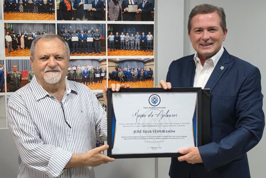 Na manhã desta terça-feira (13), o vereador Laércio Trevisan Jr. (PL) entregou a moção de aplausos 291/2025 ao professor doutor José Djair Vendramim, docente da Esalq-USP (Escola Superior de Agricultura “Luiz de Queiroz”, da Universidade de São Paulo). A honraria reconhece a inclusão do professor, em 2025, entre os 100 agrônomos mais influentes do país, segundo ranking da plataforma Research.com.