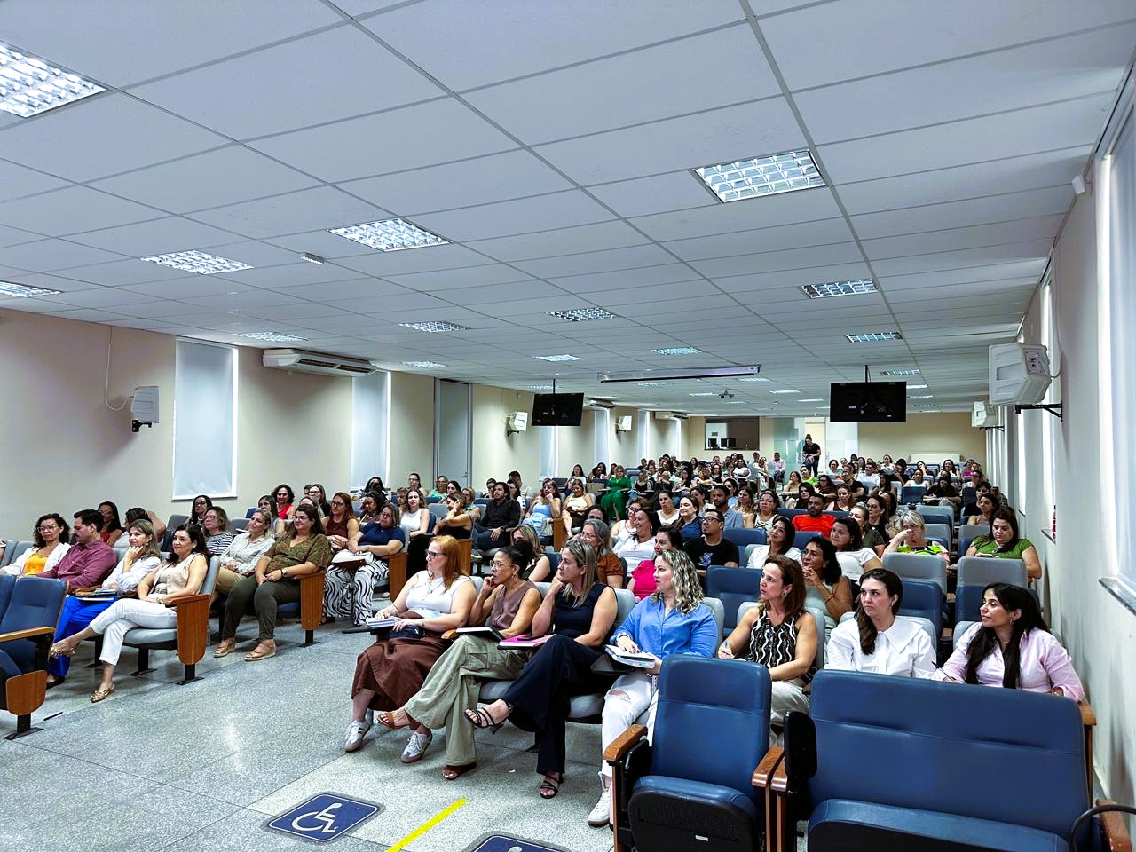 O anfiteatro Prof. Hamilton Fernando Torrezan, na sede da Secretaria Municipal de Educação, foi palco, na tarde desta quarta-feira (4), de um encontro entre a secretária Juliana Vicentin e os 125 diretores das unidades escolares da rede municipal. A reunião marcou o retorno das equipes gestoras às atividades e foi pautada pelo diálogo e pela escuta ativa.
