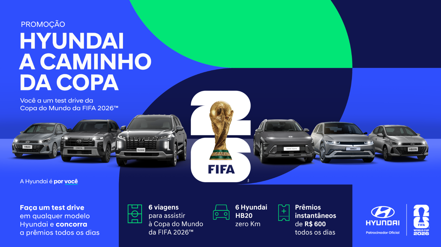A Hyundai, patrocinadora oficial da Copa do Mundo FIFA 2026™, anuncia a promoção “Hyundai a Caminho da Copa”, que irá levar seis participantes para torcer no Mundial deste ano. Até 13 de maio, todos que realizarem test drives em modelos Hyundai na rede de concessionárias da marca em todo o Brasil poderão se cadastrar e concorrer a uma das seis vagas, que dão direito a acompanhante, passagens aéreas, hospedagem, alimentação, traslados e ingressos para o duelo brasileiro contra o Marrocos, marcado para 13 de junho, em Nova Iorque (EUA).
