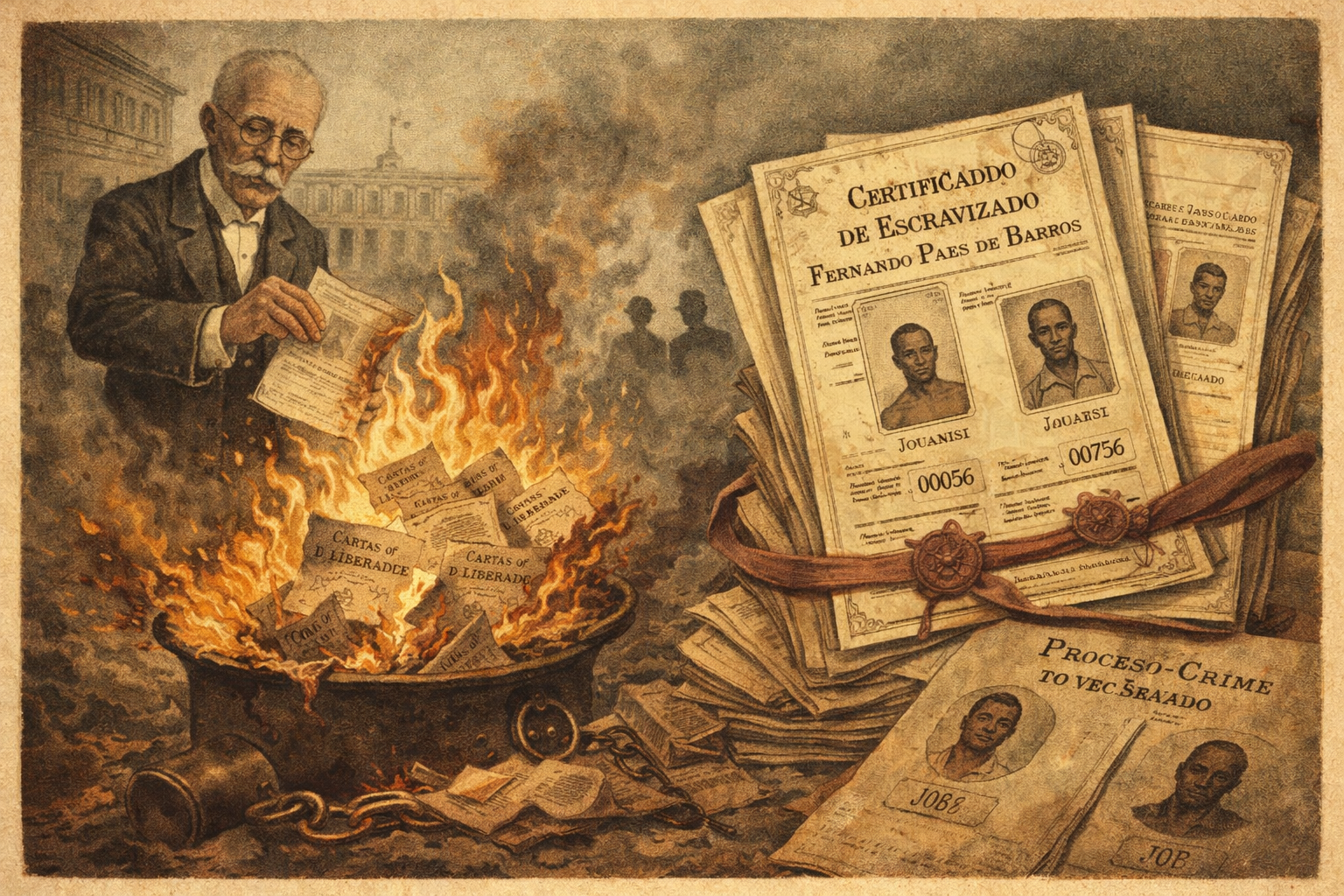 Em 14 de dezembro de 1890, o então Ministro da Fazenda Ruy Barbosa, por meio de uma portaria, decretou a destruição de todos os registros relativos a compra e venda de escravizados, documentos estes que deveriam ser enviados a capital do país (Rio de Janeiro), onde seriam queimados. Desconsiderando o debate sobre as motivações da determinação, seja por ser a República “obrigada a destruir esses vestígios por honra da pátria”, como é justificado na portaria, ou para resguardar os cofres públicos de possíveis processos indenizatórios, o fato é que não foram apenas papéis que viraram fumaça e cinzas, mas registros da história e da memória de um povo.
