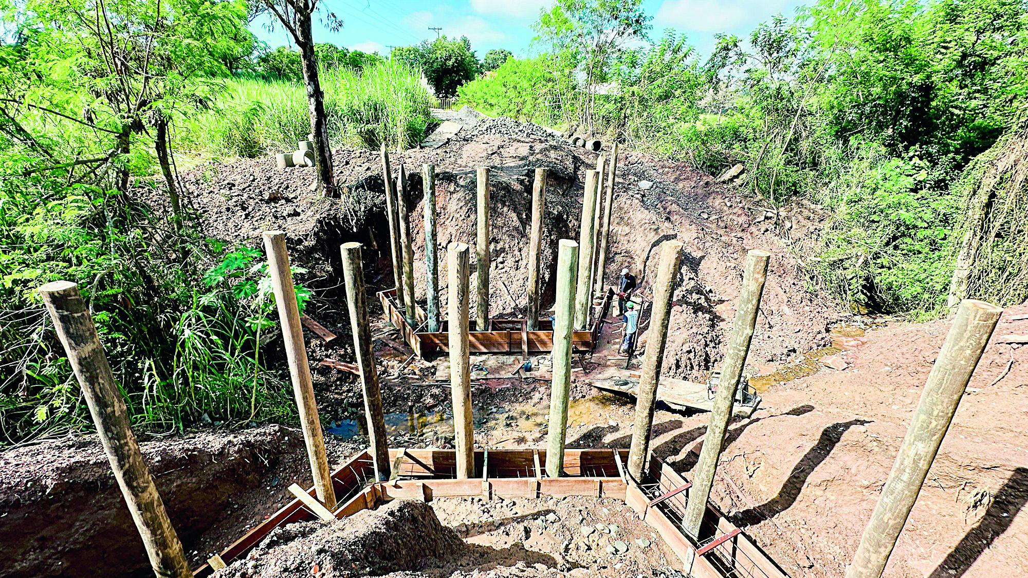 Além disso, já foi iniciada a montagem das formas que darão origem às vigas de concreto, responsáveis por integrar toda a fundação. A intervenção também inclui a adequação do leito do curso d’água, medida importante para melhorar o escoamento e reduzir os riscos de novos danos causados por enxurradas.