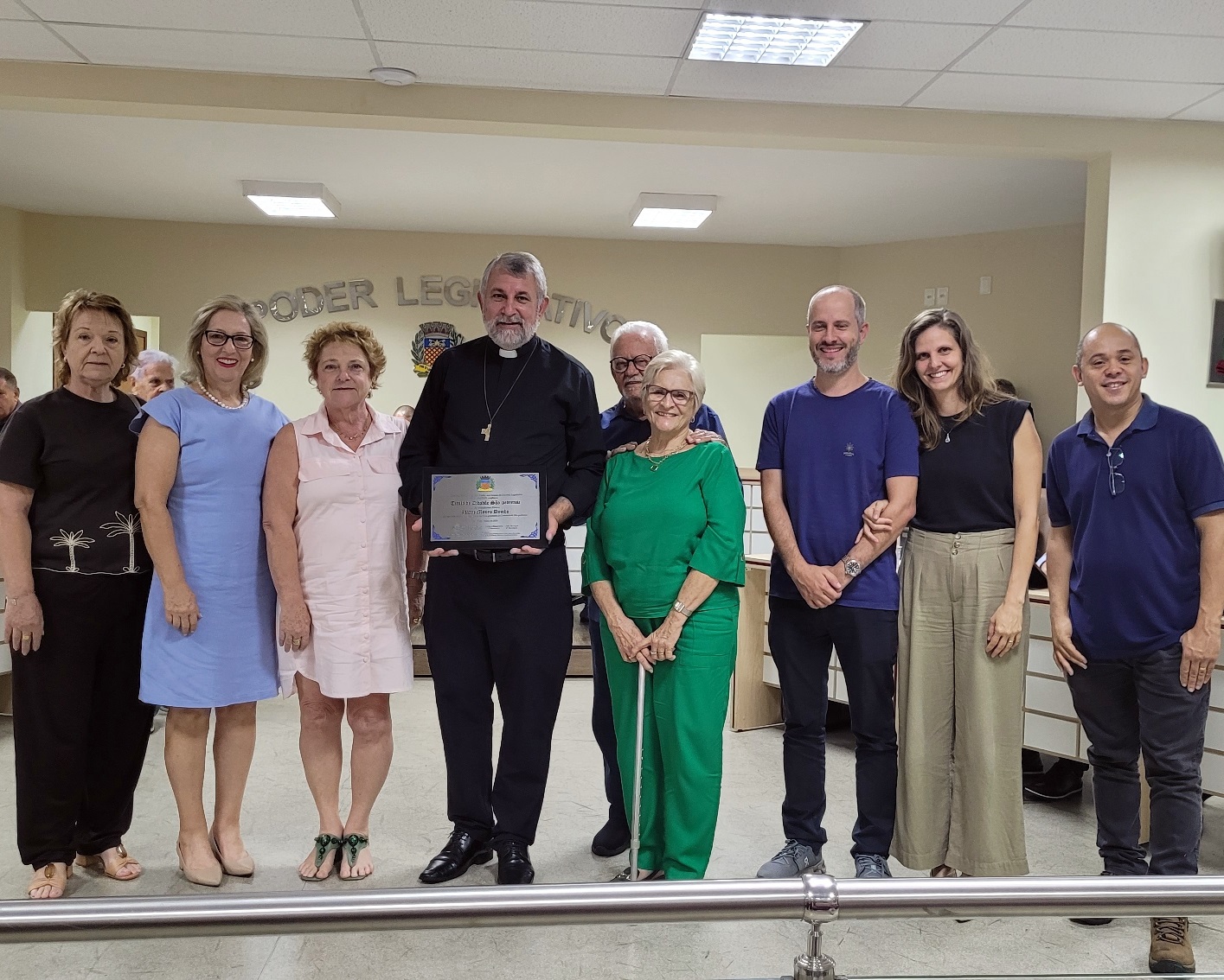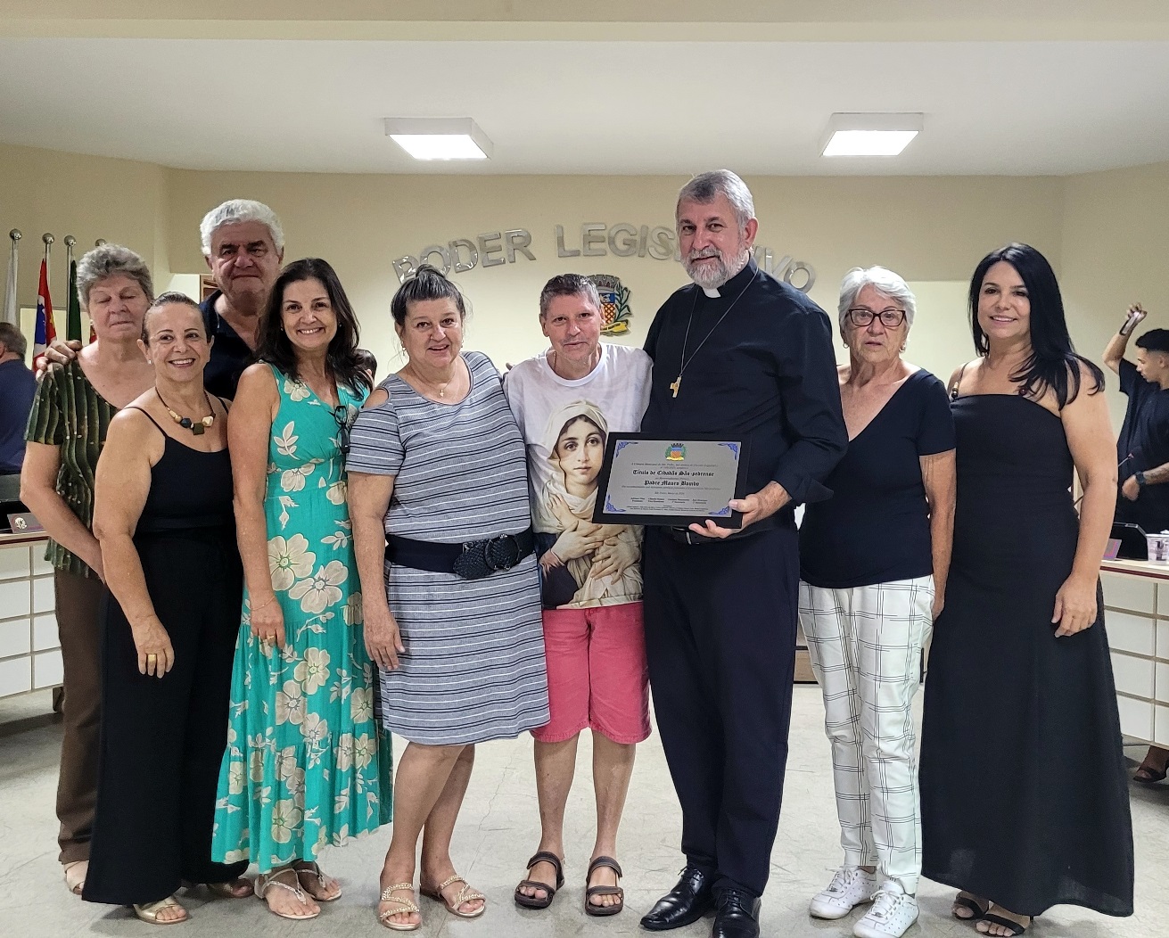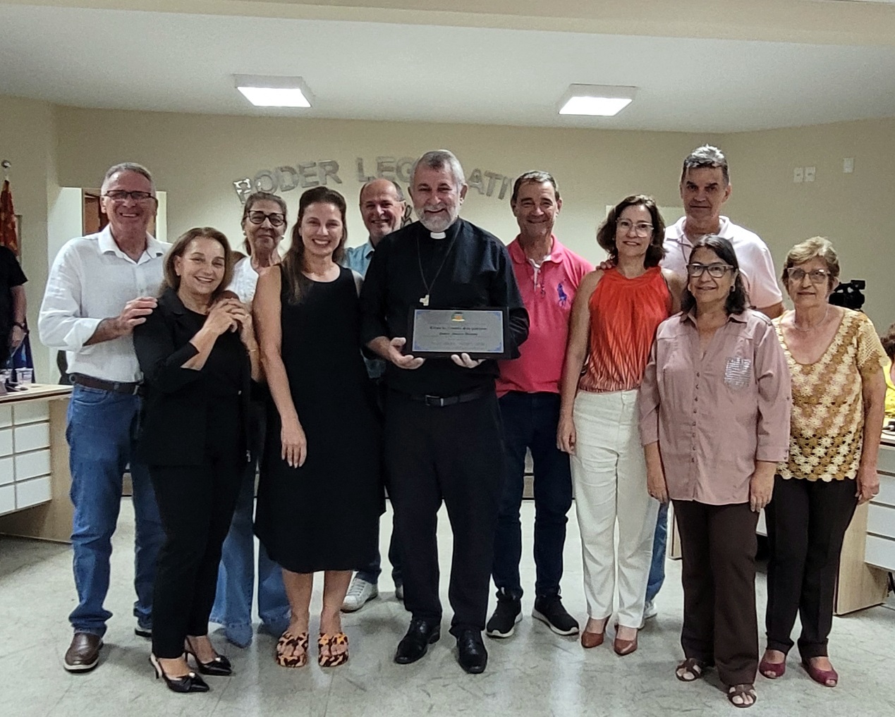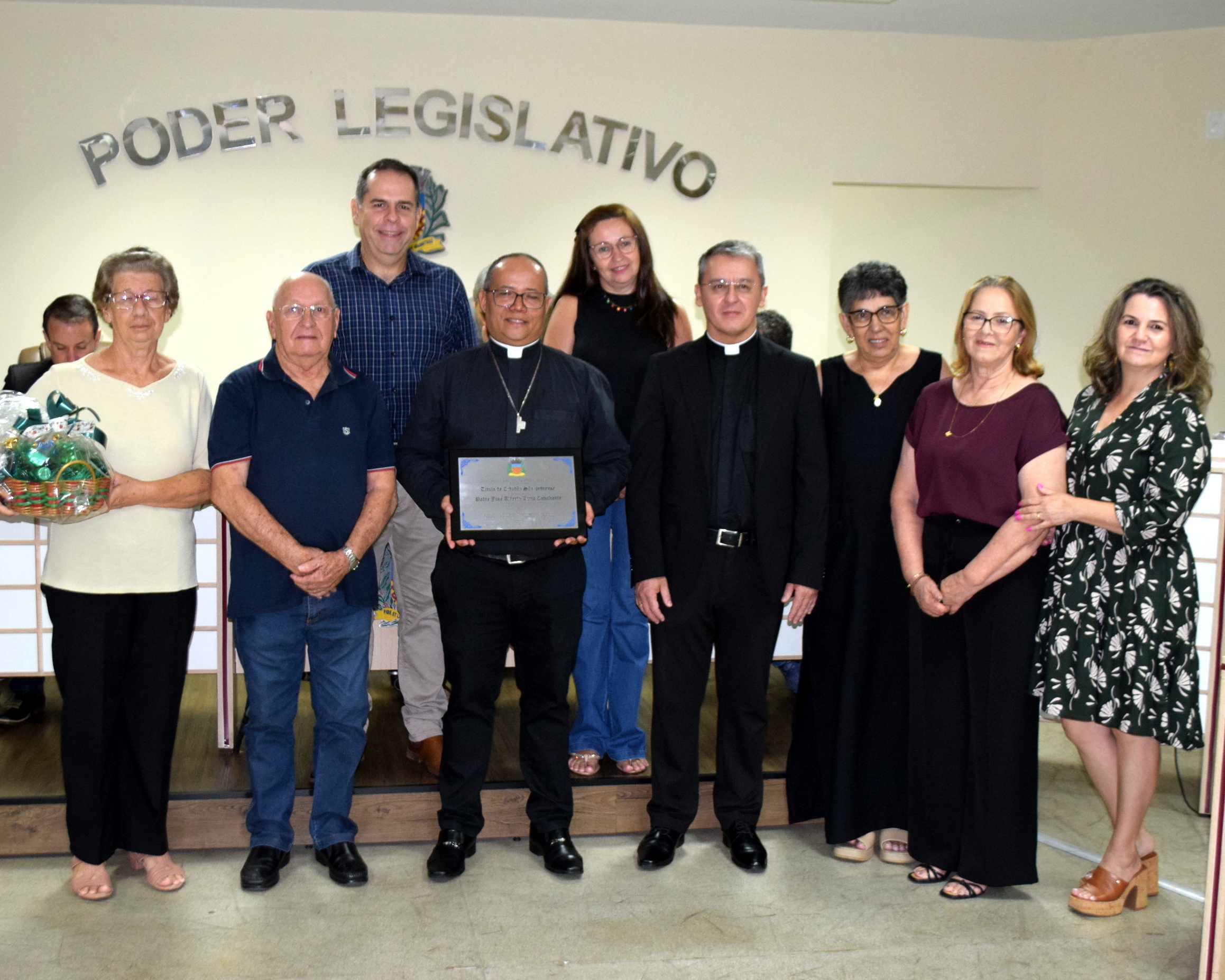 A cerimônia reuniu autoridades e representantes da comunidade católica, entre eles o padre Aguinaldo Rogério dos Santos, representando Dom Devair Araújo da Fonseca, além do prefeito Thiago Silva, do presidente da Câmara, Adriano Vitor, e demais vereadores, que prestigiaram o momento de gratidão e reconhecimento.