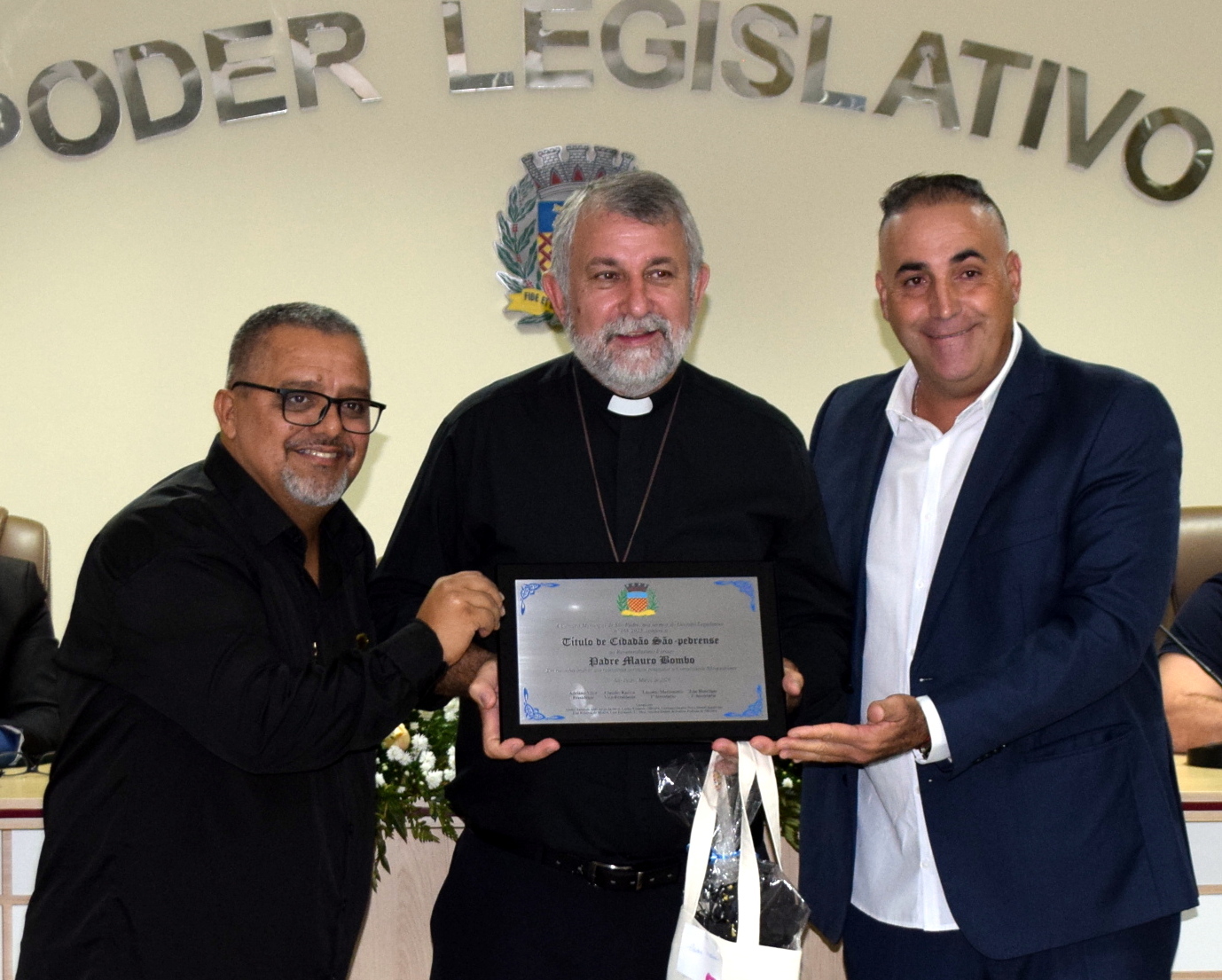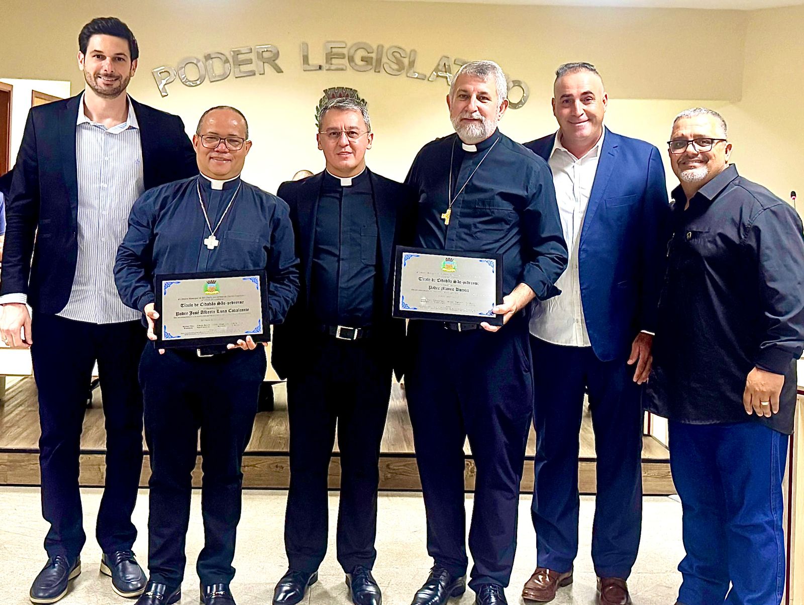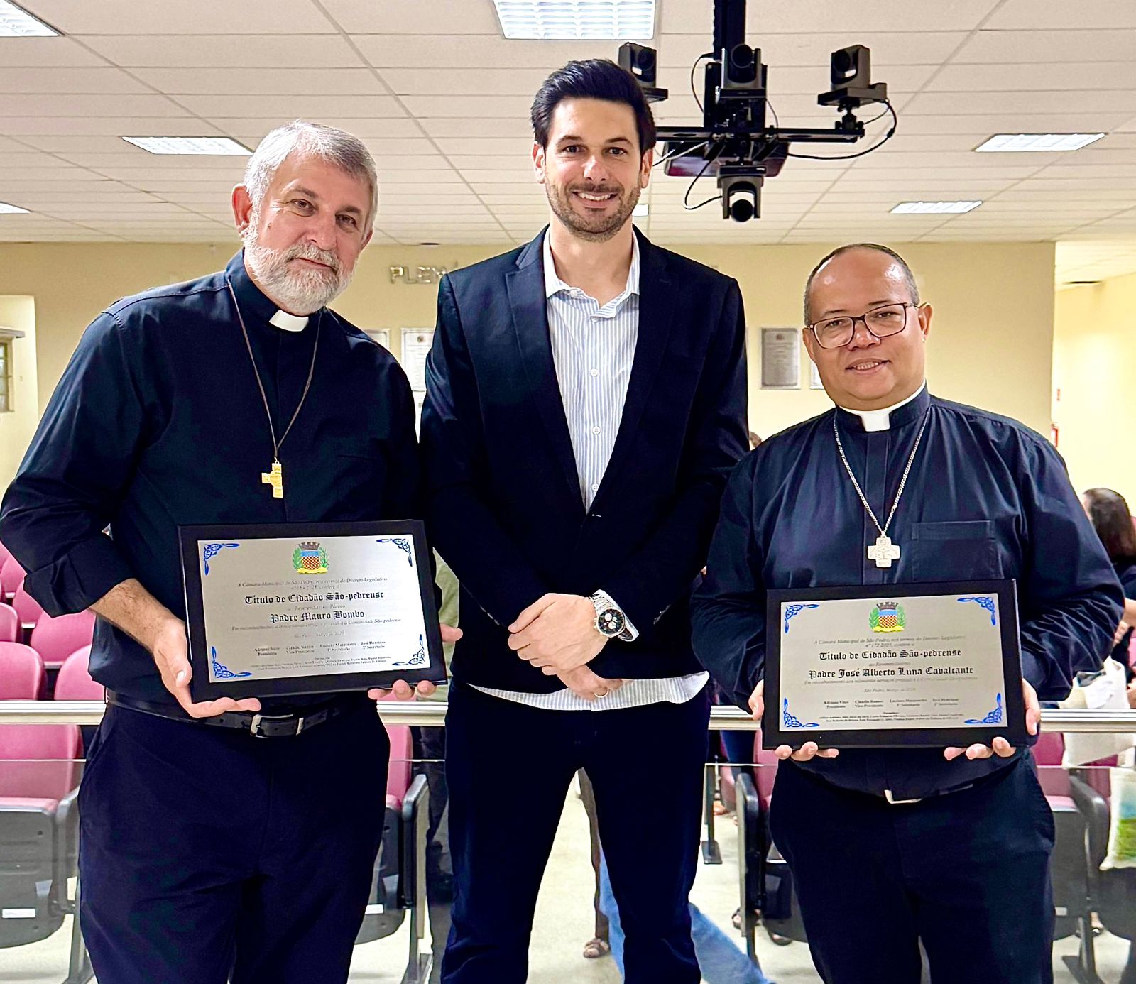 Em uma noite marcada por emoção e reconhecimento, a Câmara Municipal de São Pedro realizou, nesta quinta-feira (26), sessão solene para a entrega do Título de Cidadão São-Pedrense aos padres Mauro Bombo, pároco da Paróquia São Pedro, e José Alberto Luna Cavalcante, pároco da Paróquia São José.