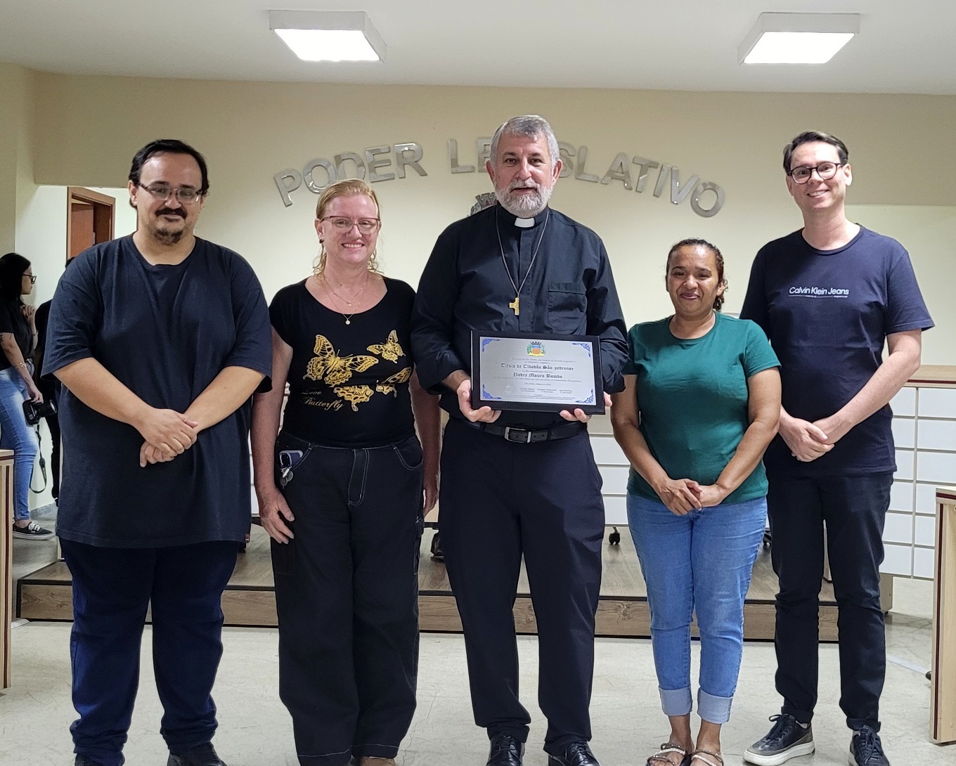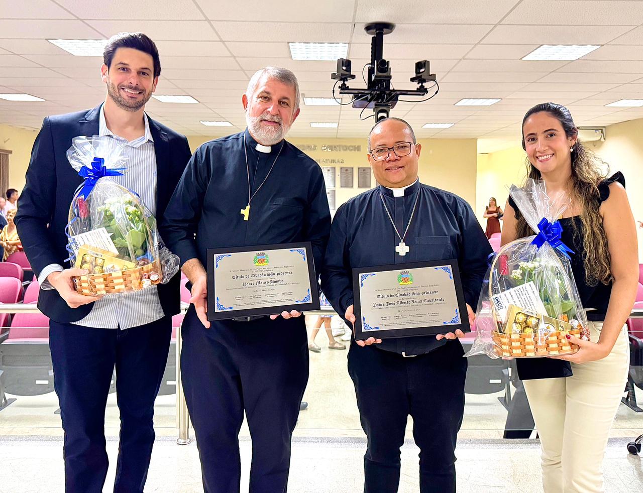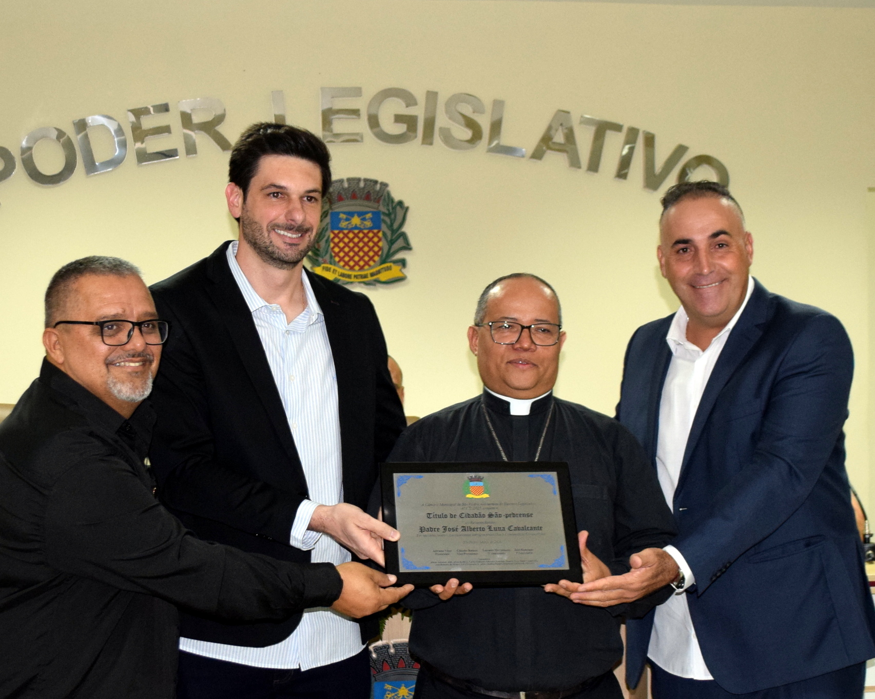 Em uma noite marcada por emoção e reconhecimento, a Câmara Municipal de São Pedro realizou, nesta quinta-feira (26), sessão solene para a entrega do Título de Cidadão São-Pedrense aos padres Mauro Bombo, pároco da Paróquia São Pedro, e José Alberto Luna Cavalcante, pároco da Paróquia São José.